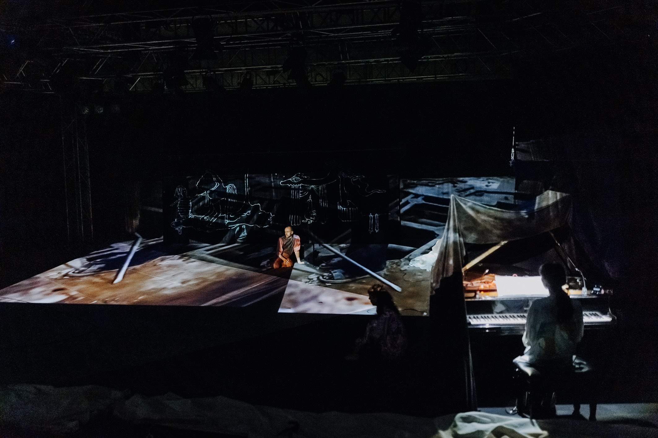 Death by Landscape, a concert invokes the magic of geology, a kaleidoscopic vision and a sense of gravity. Ghosts from surrealist painting, symbolist poet- ry, science fiction literature, classic and contemporary music are awakened and affectionately carried into a syncretic composition, a synesthetic experience, a polyphonic forest of sounds, signs, symbols and images. They are invited, like the audience, to a ritual of joyful mourning. Mourning is a mode of caring for the earth. Mourning is a celebration of the absent ones. Mourning is a spell to counter oblivion. Mourning is a longing to be together. Mourning is a political gesture. Mourning is an ode to gravity.